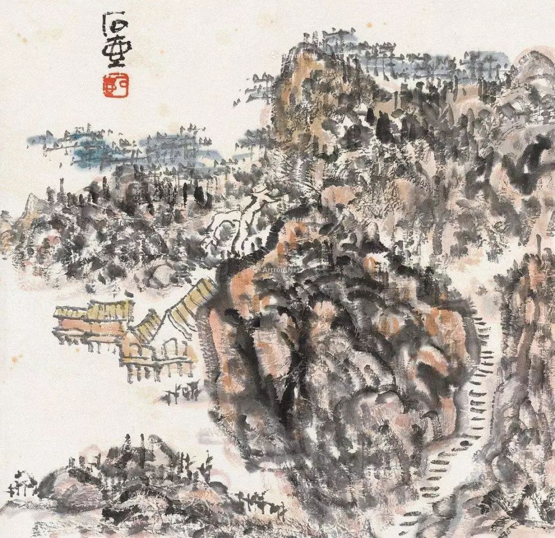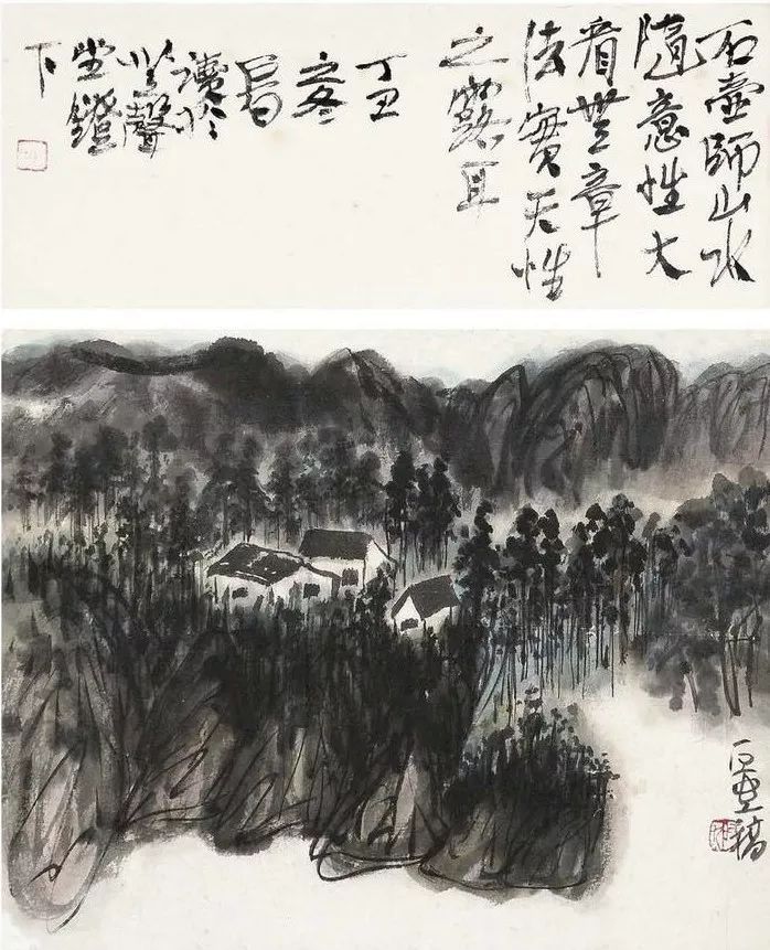 我近来画山水心爱连皴带点,用墨用色一次画成。