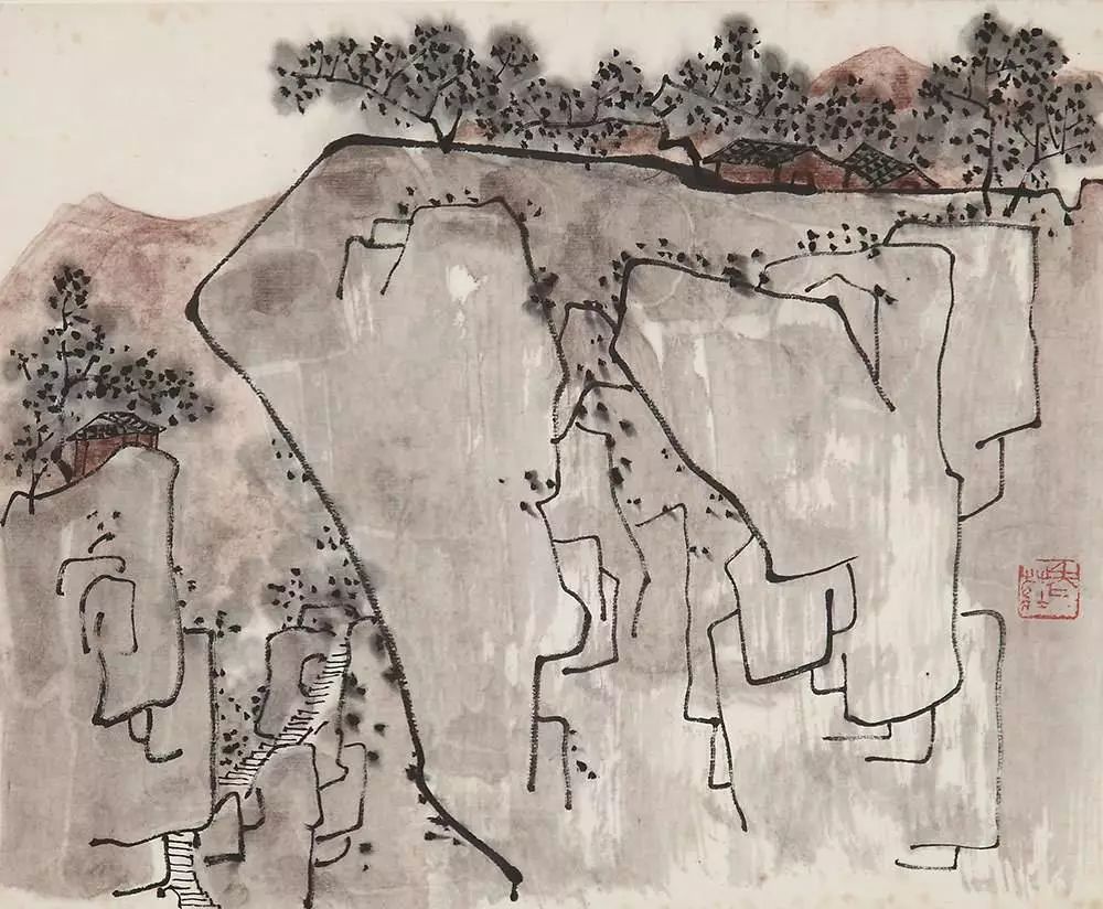 一幅画中,山石、屋子都是土红色,这是我的画法。这样惩处,色面大块,中间勾画的线条是淡墨,土红色夹些灰色,曲调很顺眼,朴素爽气。仅仅画屋子与画山石所用的勾画线条是不同的。这种规范并不透顶是我的创造,等于古东说念主的全用朱画、墨画,但我有所发展。