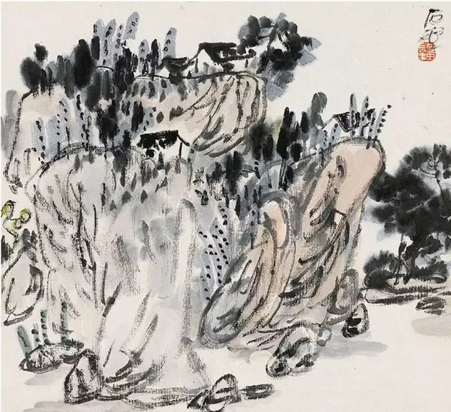 山越大,山石上苔越多,石头是“活”的。黄宾虹云“山皆湿润”,就是说画中石头须是“活”的。山虽不成动,但不成将它画成死的,所谓“顽石点头”,画画自当如斯。